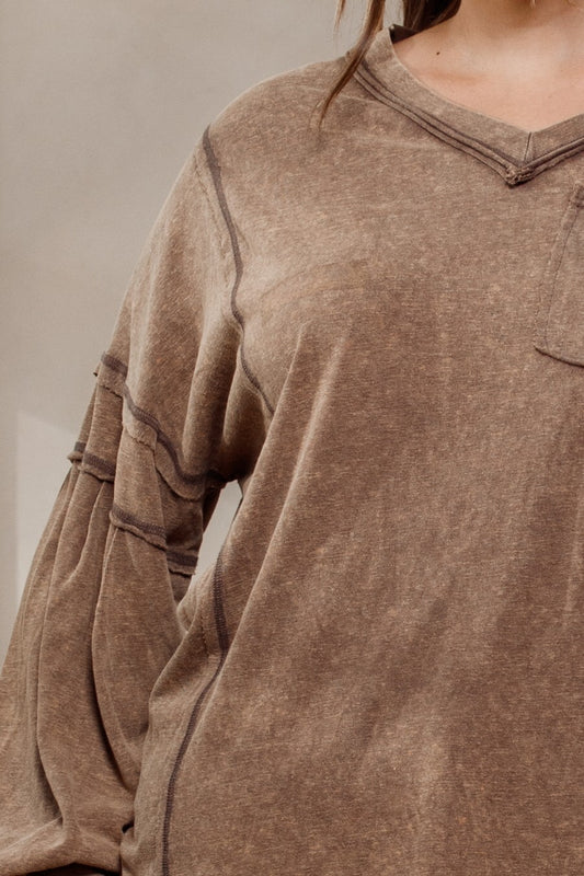 Sara Seam Patchwork Bubble Sleeve Waffle Knit Top (S-2X)
