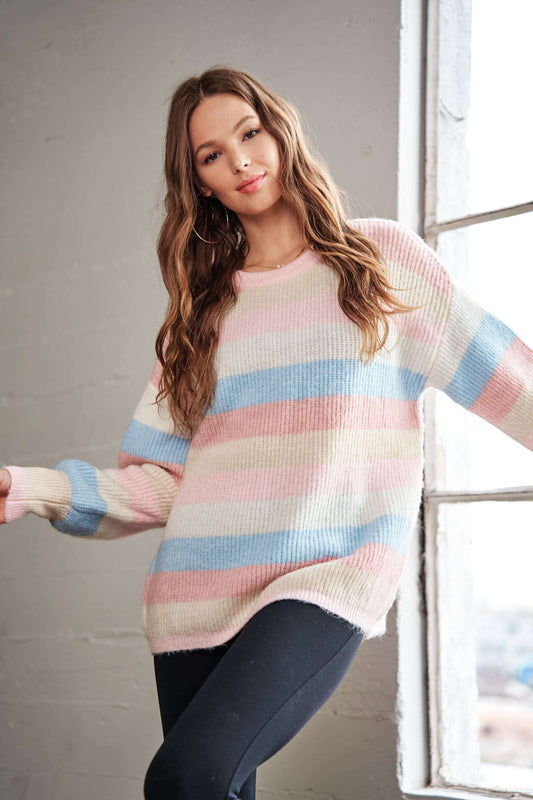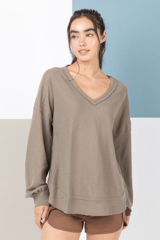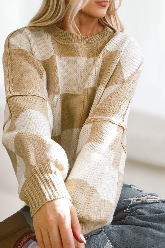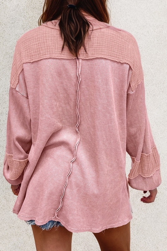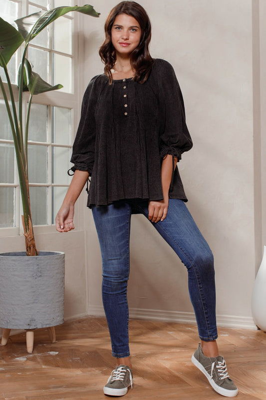 Sara Seam Patchwork Bubble Sleeve Waffle Knit Top (S-2X)
